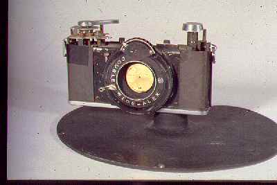 Have not completed this camera yet, although it should work in principle. This is the technicolor version of the two-color stereo camera, but it's not stereo, it just won't have a complete coincidence of the three images. This is also an outgrowth of studies in color separation (which I teach once in a while as a source for Gum-Bichromate printing). The shutter here is just three lens caps, since the required shutter speeds should be quite slow: to get the color separation negative densities to fall on the linear portion of the film curve, the film is first of all overexposed by 100 percent. Additionally, the filter factors are on the order of x6, and I would use very small f-stops since there is no control over focusing.