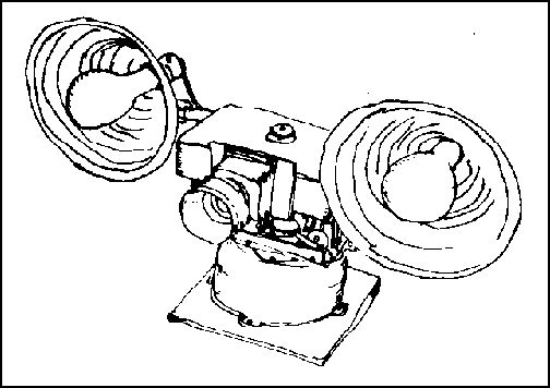 "35mm Rotating Slit-shutter Camera" 1985, HWD: 15x24x11" Reclaimed Materials: Graflex ID camera body, AC drive motor, duplex outlet, lamp sockets, 9" reflectors, commutating circuit board, lazy susan, rotating base, lens housing, Exacta lens mount.