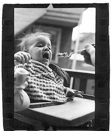 - playing with a cardboard birthday cake with Claudia, rejecting a slice and taking another: MINE DONT LIKE HOLES (a condition of his original piece)
