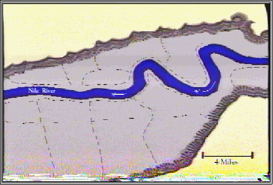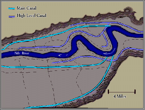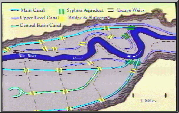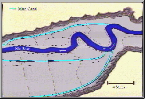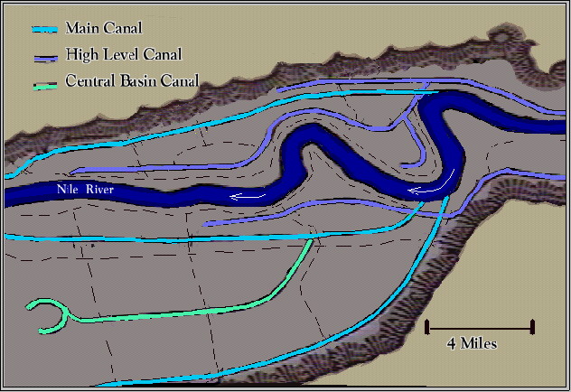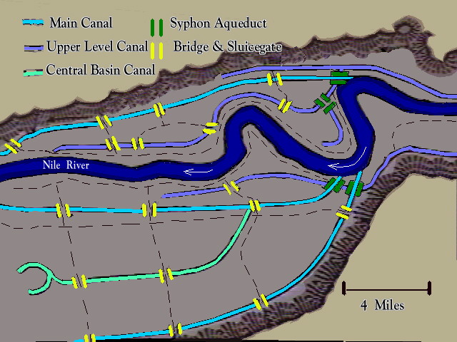 The result is a relatively consistent supply of produce to feed human agriculturalists and their livestock. We might add that wherever we find evidence for the presence of Immortals we apparently find early civilization with large rivers and irrigation: The Nile; Tigris and Euphrates; Meso America; South America; the Indus valley, in what is now Pakistan; the Yellow River, in what is now China. These civilizations seem to have been founded on a plentiful water supply coming from great rivers, necessarily controlled because such rivers can cause disastrous floods. The common element with the Canadian water key is the need to control a water supply. To understand more about how this happened in ancient times we need to look at how irrigation systems work. They were not so simple as you might think. There are different kinds but in ancient Egypt the basin system was used, so we'll look at that. First, the area to be irrigated is surrounded by embankments (that's why it's called a basin system). In ancient Egypt many of the basins were large, some covering 50,000 acres (that's over 78 square miles):